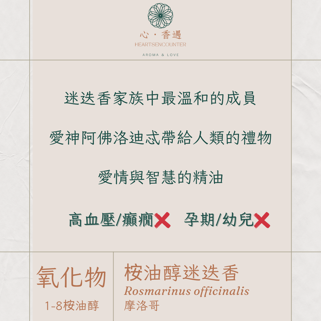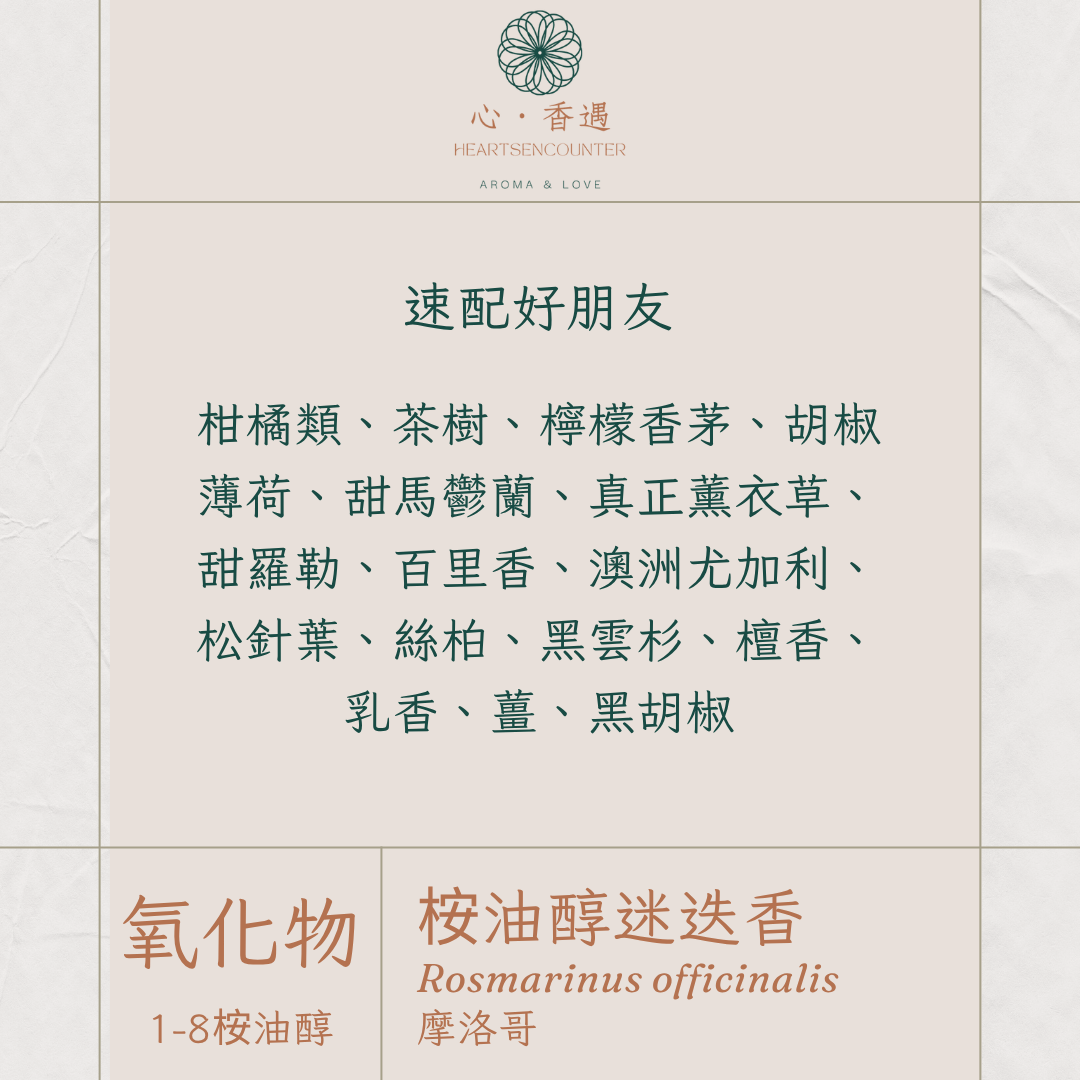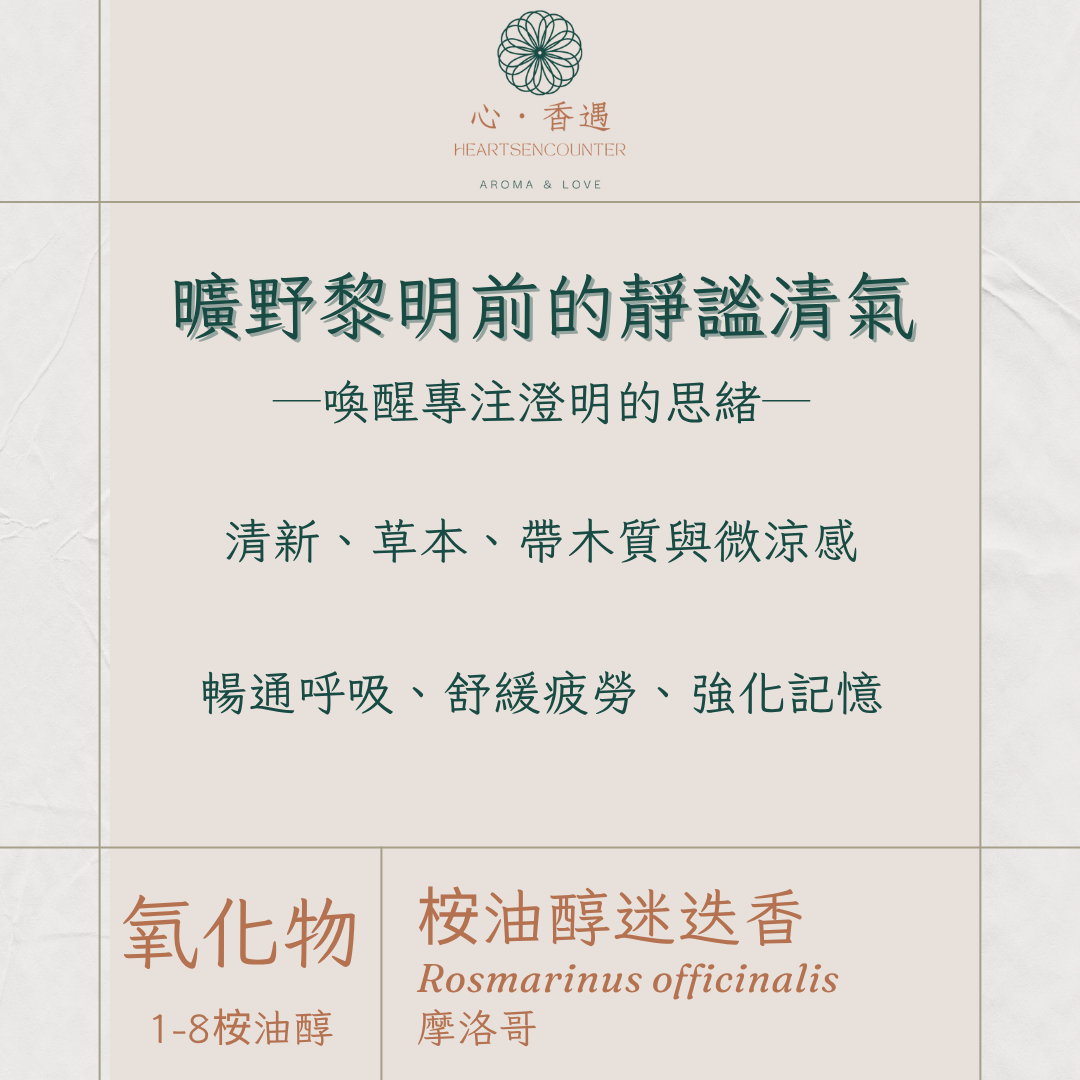 桉油醇迷迭香既有著1-8桉油醇的清爽又有著撫慰人心的沉穩力量,適合於午後或工作前使用,你可以滴幾滴在擴香石上,或與甜橙、檸檬薄荷、黑雲杉搭配,形成既提神又溫柔的香氣層次。當你覺得頭腦混亂、心情遲鈍,或缺乏行動力時,就讓這股草木間的晨霧氣息輕輕喚醒你。它不催促,只是輕輕提醒著「清晰、信任與洞察的力量,其實早就在你心裡發光」。