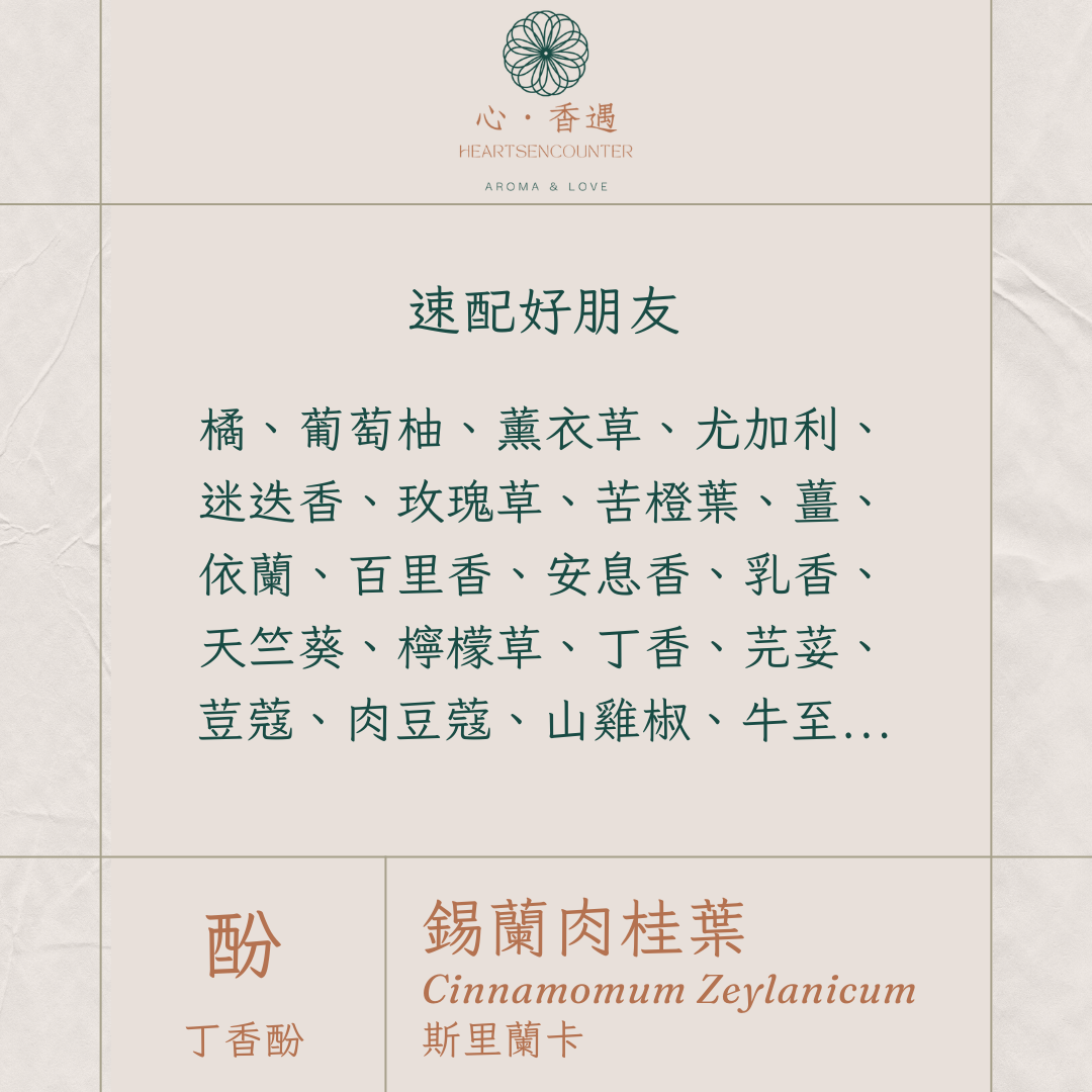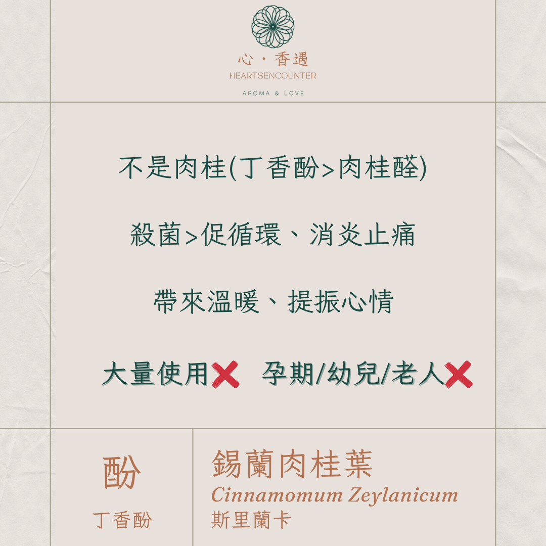※特別注意!肉桂葉有大量的酚類,刺激性高,務必稀釋使用,而孕期、幼兒和老人都不建議使用喔!